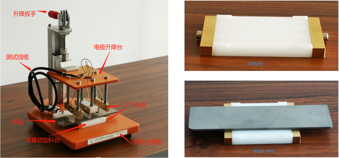 基本組成:測試臺由樣品盒、測試電極組、升降臺、支架、連接線纜等部件組成。