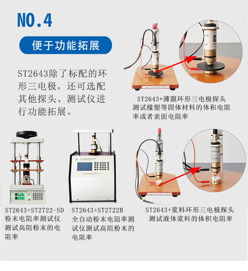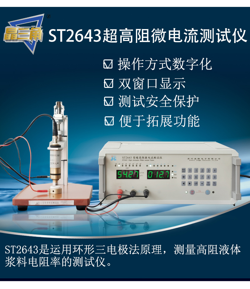 ST2643高阻儀是高阻液體體積電阻率測試儀,搭配高阻漿料環(huán)形三電極測試探頭可成為